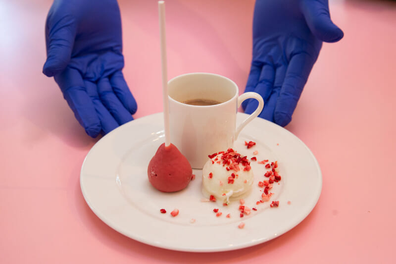 まずは、ライブスイーツをご紹介。期間中、前半(~2/23迄)・後半(2/28~4/12迄)で内容が変わり、前半のメニューは、バレンタインシーズンにぴったりな「プラリネホットチョコレート 苺とバニラアイス添え」を目の前で提供してくれます。「チョコレートでコーティングした苺をホットチョコレートに浸して、溶かしながらお召し上がりください」と、ペストリーシェフの松下さん。濃厚なチョコレートと苺のフレッシュな酸味が交わり合うチョコレート好きにはたまらない一皿です!