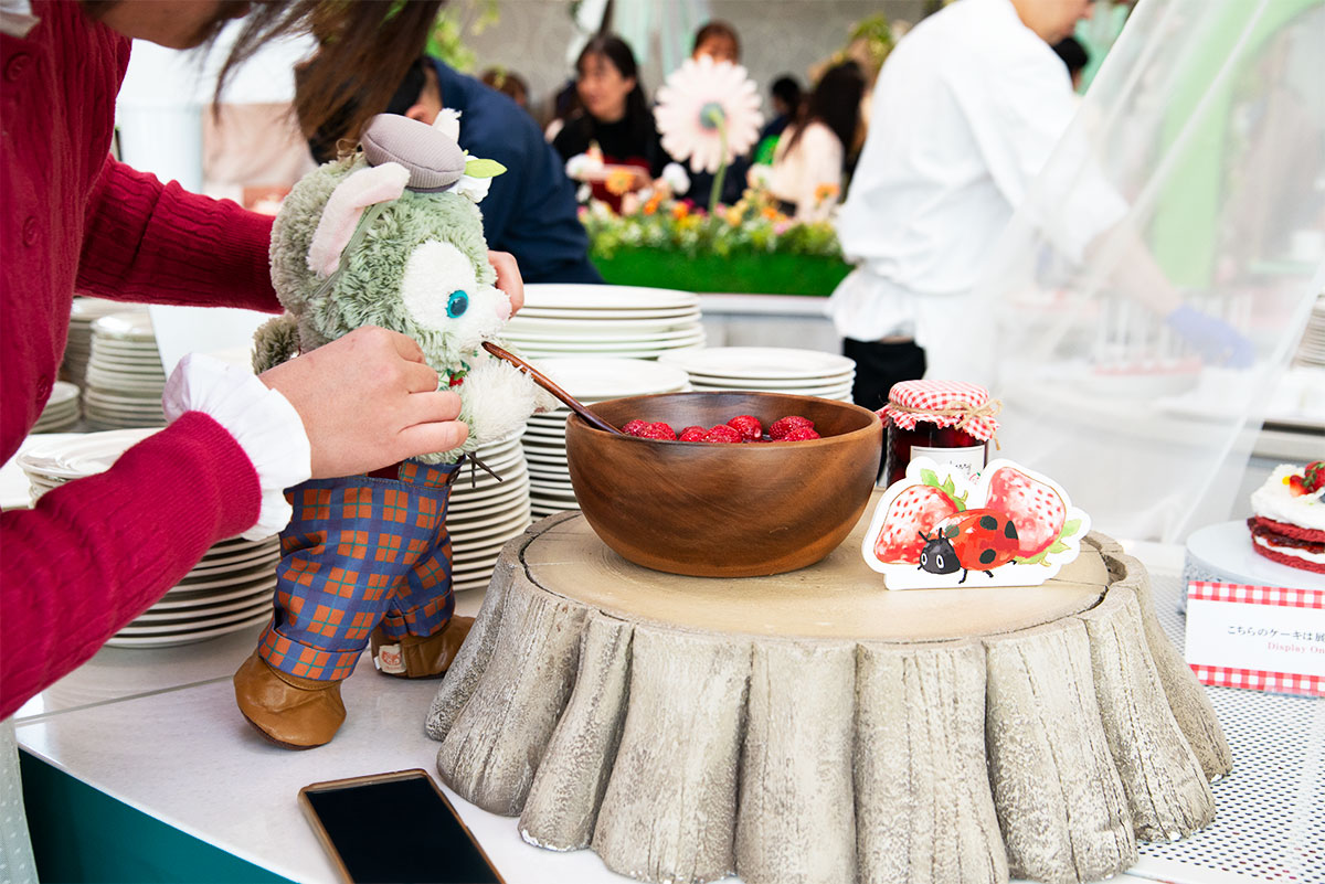 さらにビュッフェ台にはスイーツだけでなく、場所柄、「ぬい活」を楽しむ方も多く、推しのぬいと一緒にストロベリーフェアリーガーデンの世界観に入り込める空間もあるんです。この日たまたまいらっしゃった方にご協力いただき撮影させていただきました! ビュッフェ台に設置された、ポップが置いてある場所で撮影可能です。