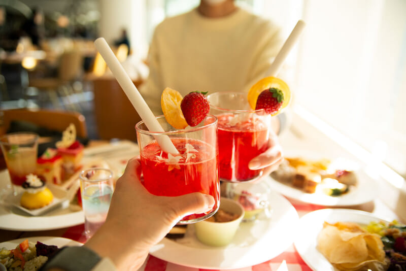 こちらは別料金で楽しめる、スペシャルノンアルコールドリンク。グラスの底に敷き詰めたのは、クラッシュしたローズと苺のゼリーが華やかで、潰した苺の果実とシロップ、アセロラジュースを注いだ、爽やかな酸味がとっても美味! ごくごくと飲み干してしまいそうになるほど、こちらもぜひ一緒にスイーツとともに楽しんでみて!