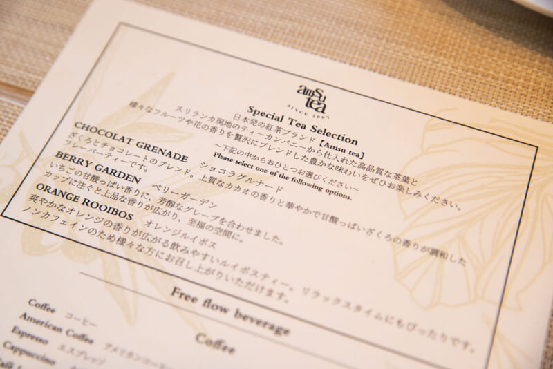 「ORANGE ROOIBOS」はオレンジの柔らかい風味がルイボスティーにぴったり爽やかで飲みやすいノンカフェインティー。とっても美味しかったです! こちらの「Special Tea Selection」以外にも、厳選された紅茶とコーヒーがホットでもアイスでも思う存分いただけるので、ゆったりとアフタヌーンティーを楽しめます。