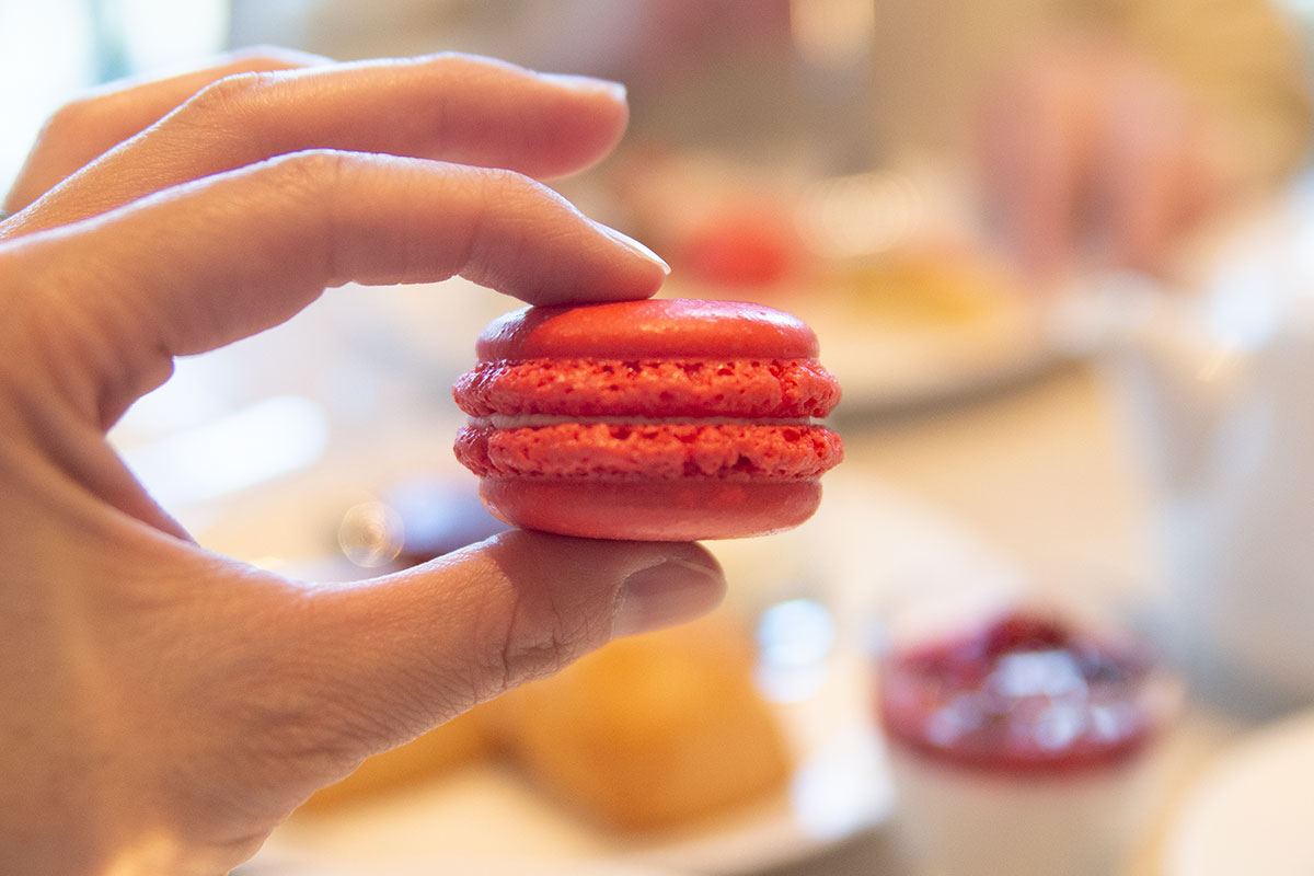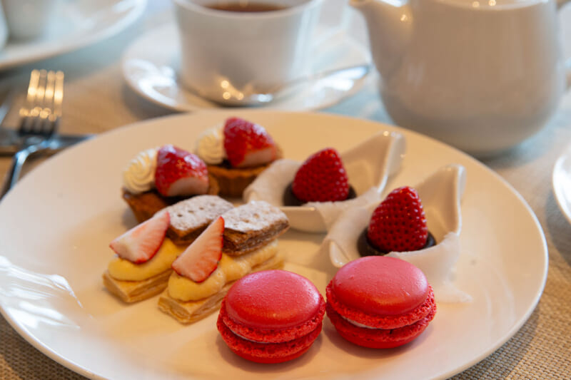 そして真っ赤に輝く「いちごのマカロン」は見た目以上に美味でした。マカロンの中はバタークリームなのに、重くない味わい深いクリームは酸味のあるいちごにぴったり! そして王道の「いちごのミルフィーユ」はパイのミルフィーユが格別。香ばしさとともに甘酸っぱいいちごとカスタード、香ばしいパイ生地がたまりません。「いちごとルバーブのタルトレット」は紅茶とぜひともいただいてみて、特別なアフタヌーンを過ごしていることを実感できちゃいます。