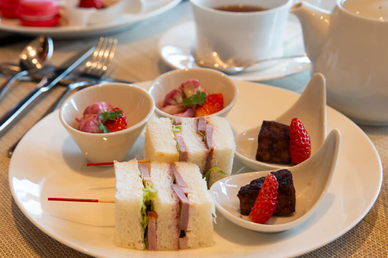 さらにさらに3段目のセイボリーのお皿も、スイーツの合間でもお好きなタイミングでいただいてみて。セイボリーにもいちごを使用しており、存分にいちごをいただけます。「いちごと燻製鴨肉、クリームチーズ、ナッツのサンドイッチ」では、見た目にいちごが使用されているようには見えませんが、燻製鴨肉のパンの間にいちごジャムが! 鴨肉との相性も抜群です。「いちごと赤ワイン風味のヴィネガーポーク」は豚肉のメイン料理のように、豚肉の脂とフレッシュいちご、そして程よい塩味も、本格的なお料理をいただいたかのような気分に。そして「いちごと根菜のホワイトバルサミコマリネ」はさっぱりなのにお野菜の甘みを十分に感じ、柔らかないちごの香りが食欲をそそります。