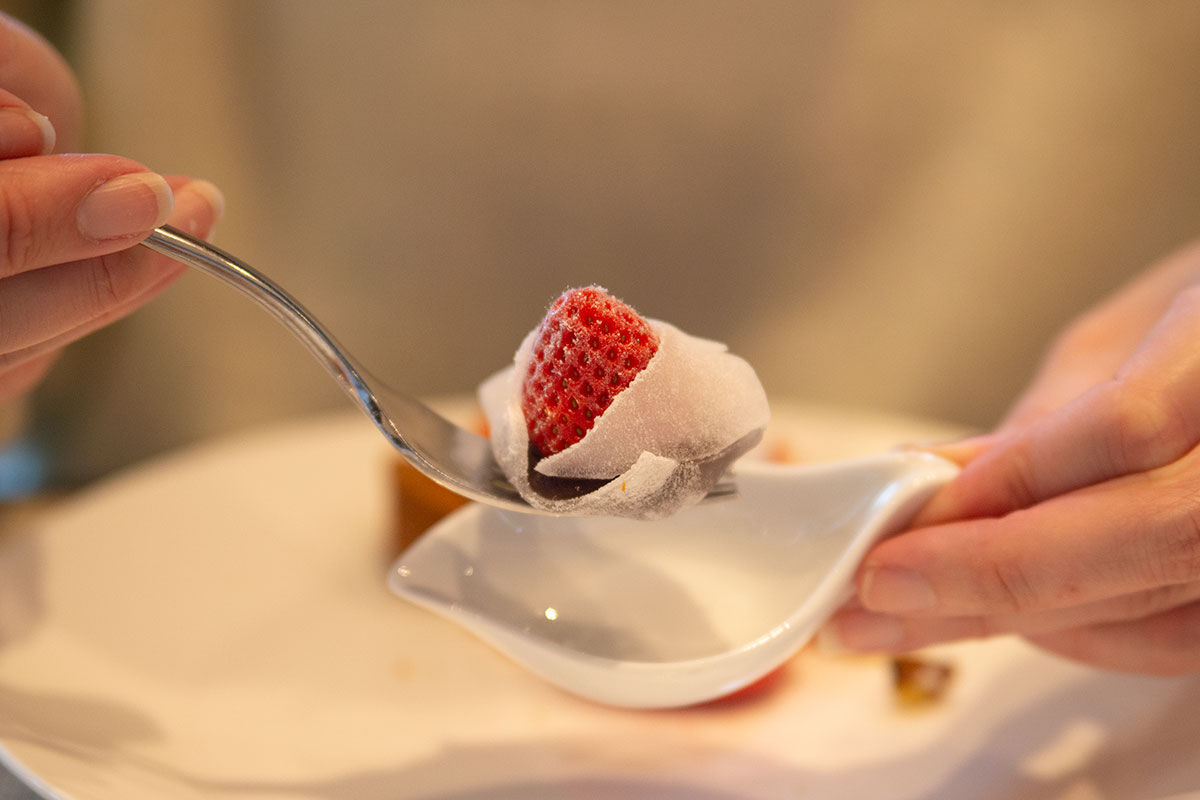 そして2段目のお皿には、「いちごのマカロン」「いちご大福」、「いちごのミルフィーユ」「いちごとルバーブのタルトレット」など焼き菓子を中心にしたスイーツが。中でも気になっていた「いちご大福」はどうやって食べようか? と楽しみながらいただけるも楽しい! 少し粒が立つ粒あんといちごに、求肥をかぶせていただきましたが、フレッシュないちごが口の中ではじけて幸せいっぱい!