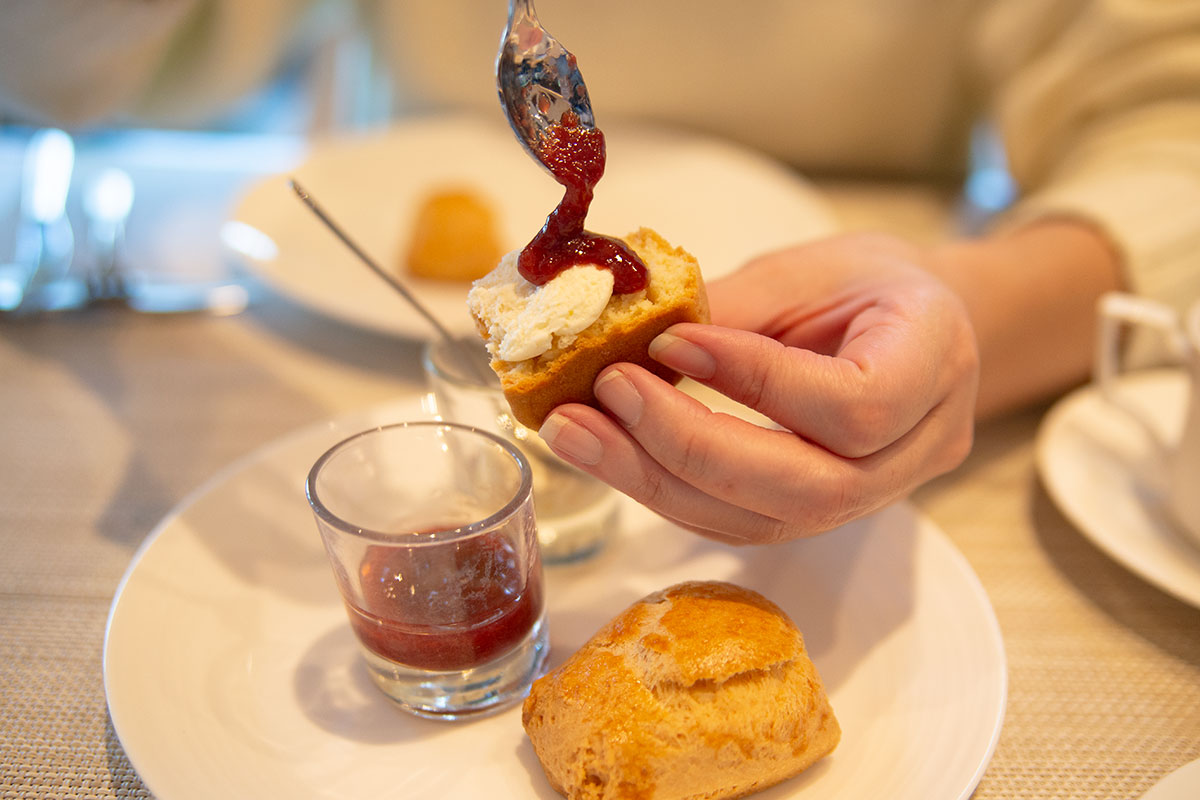 そして焼き立てのスコーンには、クロテッドクリームとラム酒風味のいちごジャムをつけて。スコーンはサクッとしっとりしたスコーン。香ばしい香りに、いちごジャムのフレッシュ感、濃厚なのにさっぱりなクリームは永遠にいただけそうです!