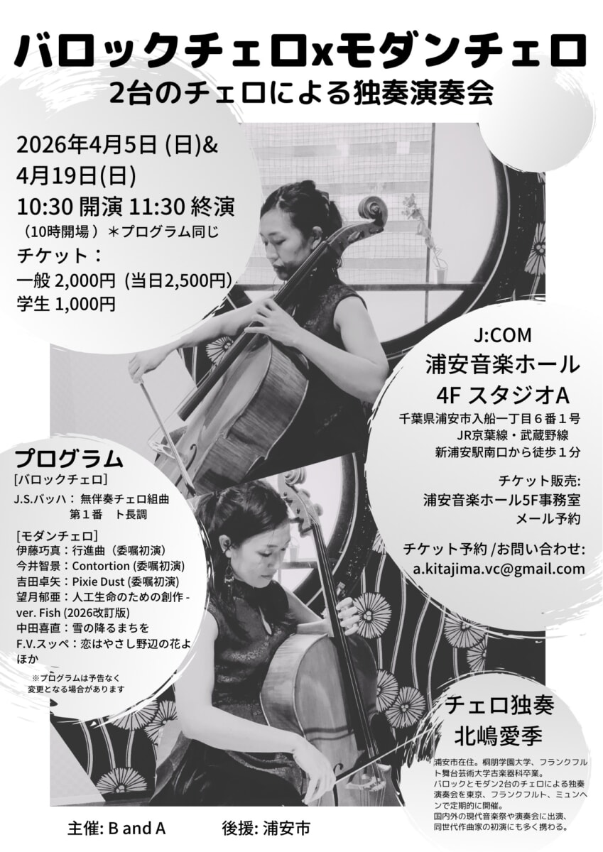 4/5(日)、19(日)開催|バロックチェロ×モダンチェロ~2台のチェロによる独奏演奏会2026~@J:COM浦安音楽ホール