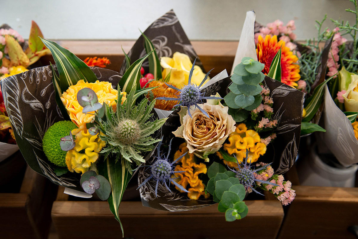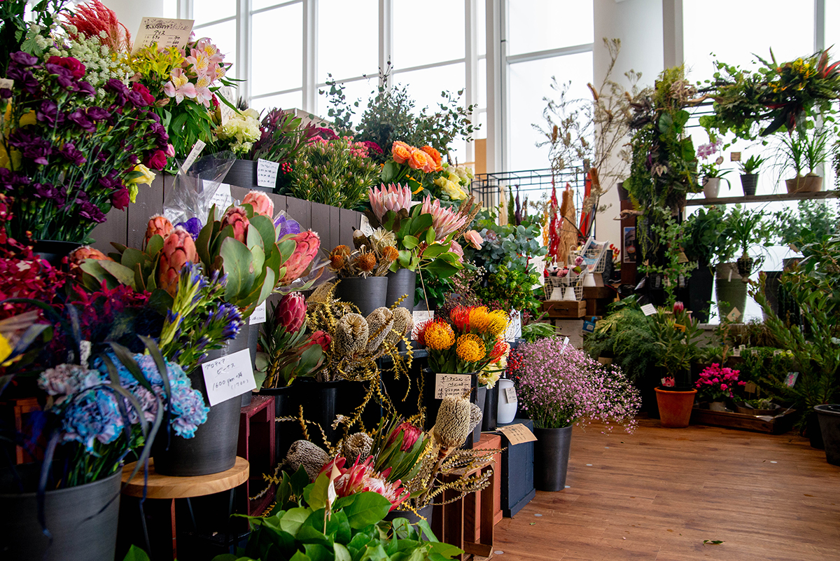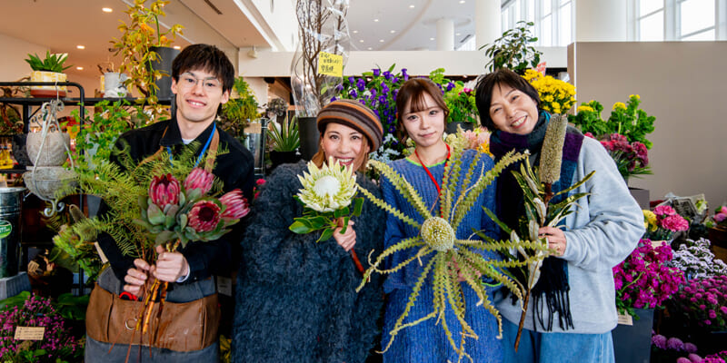 ブラシのような形に、アクセサリーみたいに可愛いお花、ふわふわだったりチクチクだったり…、一つひとつが個性的で眺めているだけで楽しくなってきます。「これはネイティブフラワーというお花なんですよ」と教えてくれたのは、オーナーの金城麻実さんと店長の山本真世さん。「二子玉川の本店は今年で20周年ですが、実は新浦安でも20年前からお花の教室を続けてきたんです」そんな長いご縁を経て、昨年ついに新浦安にお店をオープン。「待ってました、と教室の生徒さんがスタッフとして戻ってきてくれたり、まるで地元に帰ってきたような温かい空気があるんです」と金城さんは嬉しそうに話します。