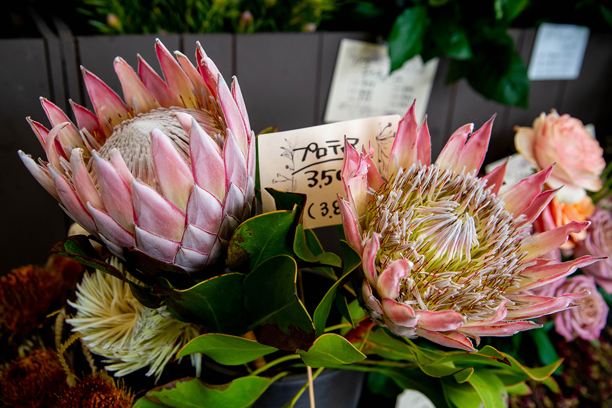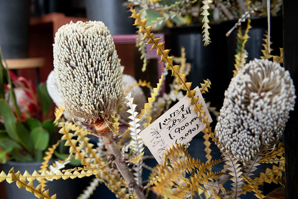 店内を見回すと、思わず「えっ、これ本物?」と声が出てしまうような植物がずらり。これらがオーストラリアや南アフリカ、ニュージーランドなどで自生する「ネイティブフラワー」です。キングプロテア、ピンクッション、バンクシア、グレベリア……名前も姿もとにかく個性的。「国産で育てている農家さんは、数えられる程度。市場に出回る量も本当に少ない。なかには”じゃんけん”で買う権利を決めることもあるんですよ」と驚きのエピソードも。店頭には年にわずか1〜2週間しか出回らない幻の花、希少な鉢物も並んでいました!
