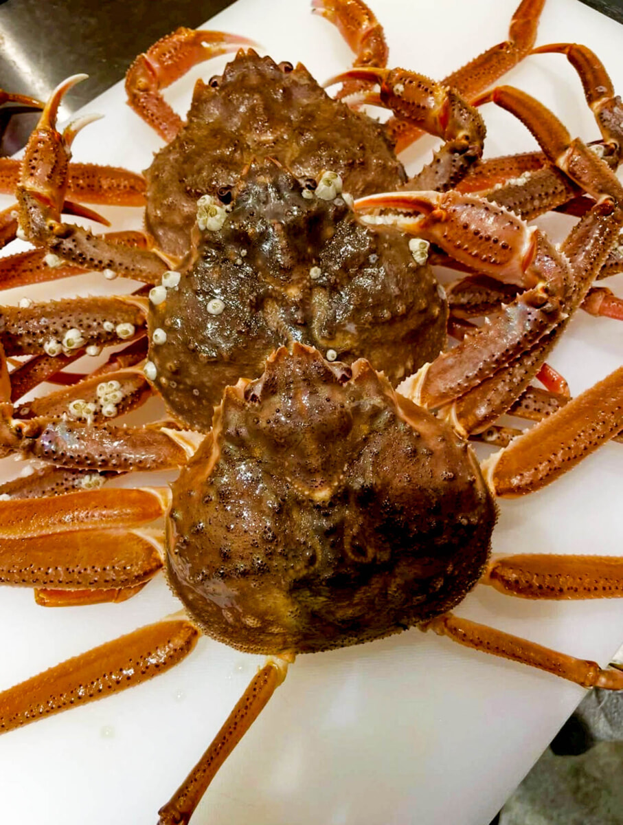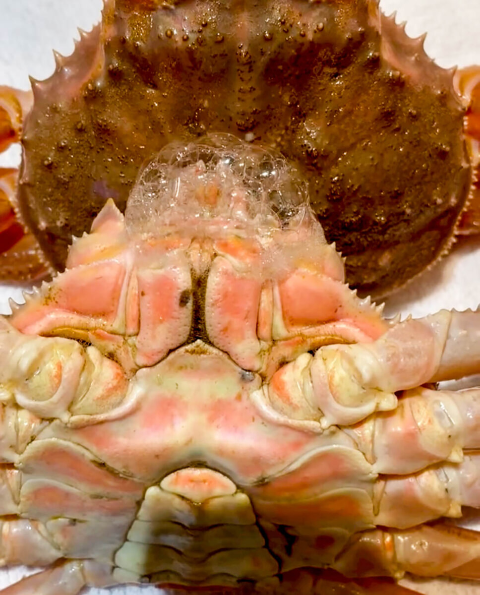 ブクブクと泡を吹く姿からも、新鮮さを感じるズワイガニ。「蟹はあけてみないと分からないけれど、活きていれば間違いないから」と活きたまま仕入れ、その日のうちに蒸しあげています。