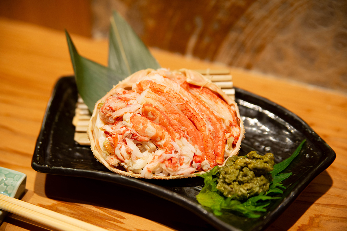 蟹一杯分を余すことなく詰め込んだ「蟹の甲羅盛り(2,000円~3,000円)」。 全て手作業でほぐすため、ひと盛りに約20分ほどかかるのだそう!味はもちろん、美しい盛り付けにも一切の手間を惜しまない醍醐さんの手腕が光る逸品です。