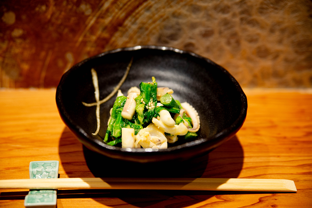 (写真左)豊洲で目利きした旬を詰め込んだ「お造り盛り合わせ(1人前1,500円~)」。 包丁の入れ方ひとつで変わる舌触りと甘みは、繊細な仕事の証。彩りを添える器は、お母様が愛用していたものなのだそう。(写真右)「菜の花とすみイカ下足のからし酢みそ和え(980円)」はサクっと音を立てる歯ごたえを残した菜の花と、ねっとり柔らかく旨味の濃いスミイカの食感が楽しい。酸味を少し立たせつつ、塩味と甘味が見事に調和した自家製酢味噌があとを引きます。