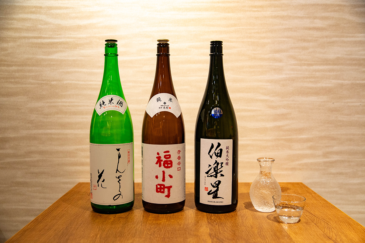 お酒の種類も豊富。日本酒は日本酒専門の仕入れ先から取り寄せるなど、しんさだの料理との相性も大切に。料理もお酒も、その時の”旬”を味わって。