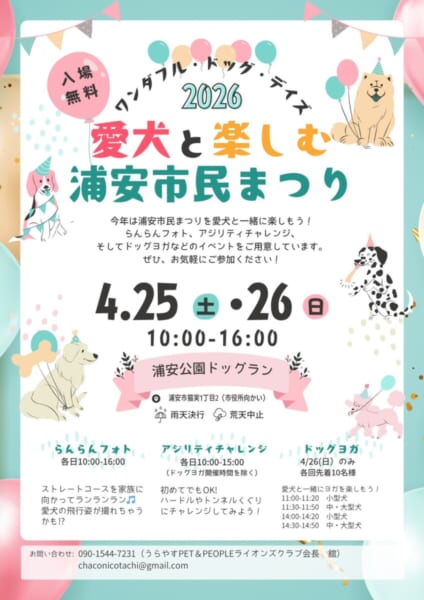 新緑が心地よい季節、4月25日(土)・26日(日)の2日間「第28回 浦安市民まつり」が開催されます。楽しい特設ステージ公演、飲食・物販などの出店・キッチンカーなど、一日中遊べますね。数ある魅力的なコンテンツの中でも、特に愛犬家たちの注目を集めているのが、浦安公園内に特設される「ドッグラン」コーナーです。