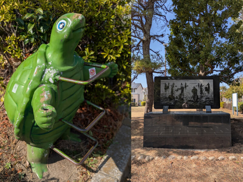 この街の最も興味深い点は、かつて高洲が豊かな漁場だったという歴史ではないでしょうか。昭和初期まで、高洲や今川の一帯には広大な浅瀬と干潟が広がっていました。そこでは「脚立」に乗ってアオギスを狙う、全国的にも珍しい独特の漁法が行われていたそうです。かつての海には「ぼんぎ」と呼ばれる木の棒が数多く立てられ、漁場の目印として活用されていました。高洲の「浦安市漁業記念公園」には今もその名残がモニュメントとして保存されています。碑文によれば、豊漁を祈念して水神祭が行われていた場所は「竜宮ぼんぎ」と呼ばれ、漁師たちの信仰を集めていたといいます。公園内には、漁業の繁栄を象徴する記念碑や、天皇陛下より植樹された銀杏の大樹、アサリをかたどったオブジェ、そして当時の原風景を描いた壁画が並びます。目を閉じれば、潮の香りと共に当時の活気が蘇ってくるかのようです。