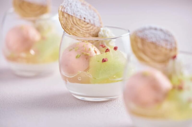 なめらかなパンナコッタに、メロンアイスとみずみずしいメロンの果肉を重ね、レモンジュレで爽やかなアクセントをプラス。仕上げにはフリーズドライ苺やライムの皮が削られ、初夏にふさわしい香り高いデザートに仕上がっています。
