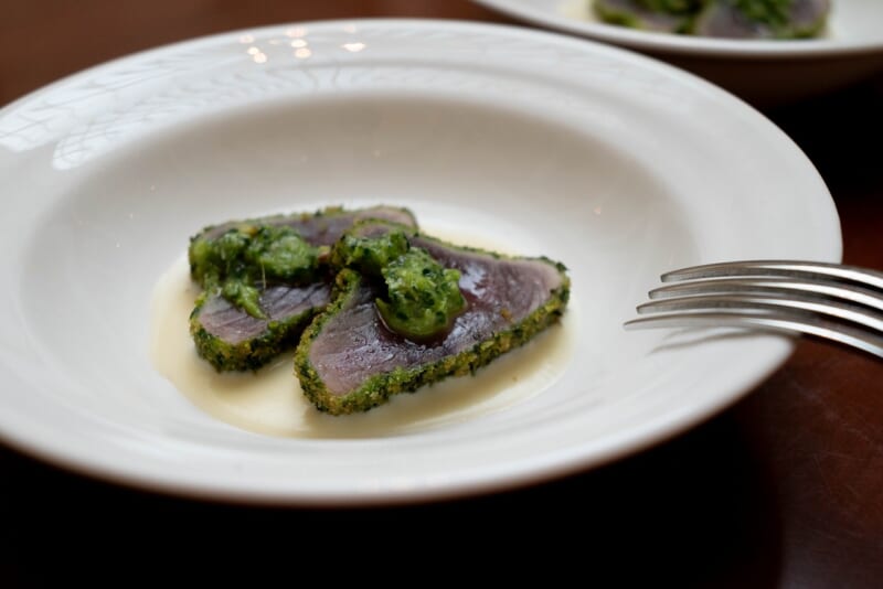 外側は香ばしく、内側はしっとりとした食感の違いが楽しめる一品です。香草パン粉を使ったハーブの豊かな香りが鰹の旨みを引き立てます。小松菜とバジルのペーストを使ったサルサヴェルデ(ソース)にはペカンナッツが入っており、コクと食感がクセになりますよ。