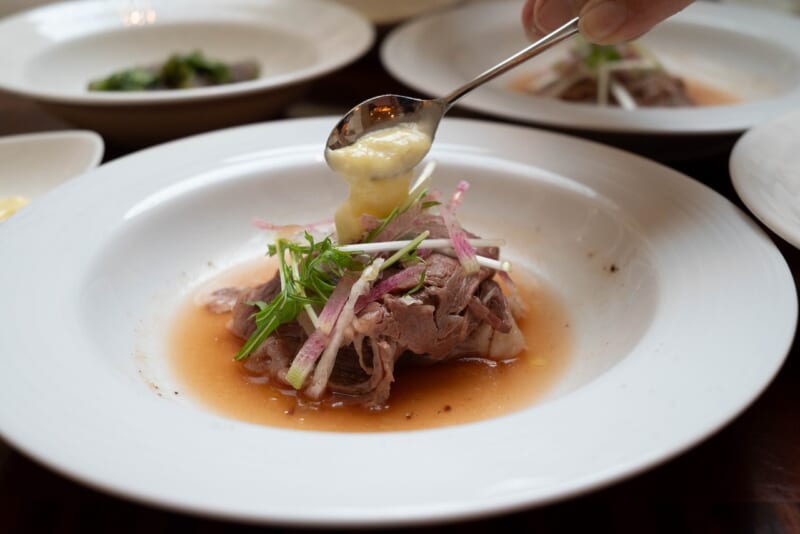 特製だしが牛肉の旨みを引き立てる和のしゃぶしゃぶに、フレッシュトマトを使った爽やかなソースで洋のエッセンスを融合。軽やかな酸味がたまらない、特別な一皿!