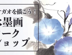 ご好評をいただいております「手ぶらで気軽に描ける、水墨画ワークショップ」を開催いたします。今回のお題は「アサガオ」です。いずれも3セット(午前の部→10時~13時、午後の部→14時~17時、夜間の部→18時~21時)ご用意いたしました。お子様同伴の親子さまはペア価格にて承ります。